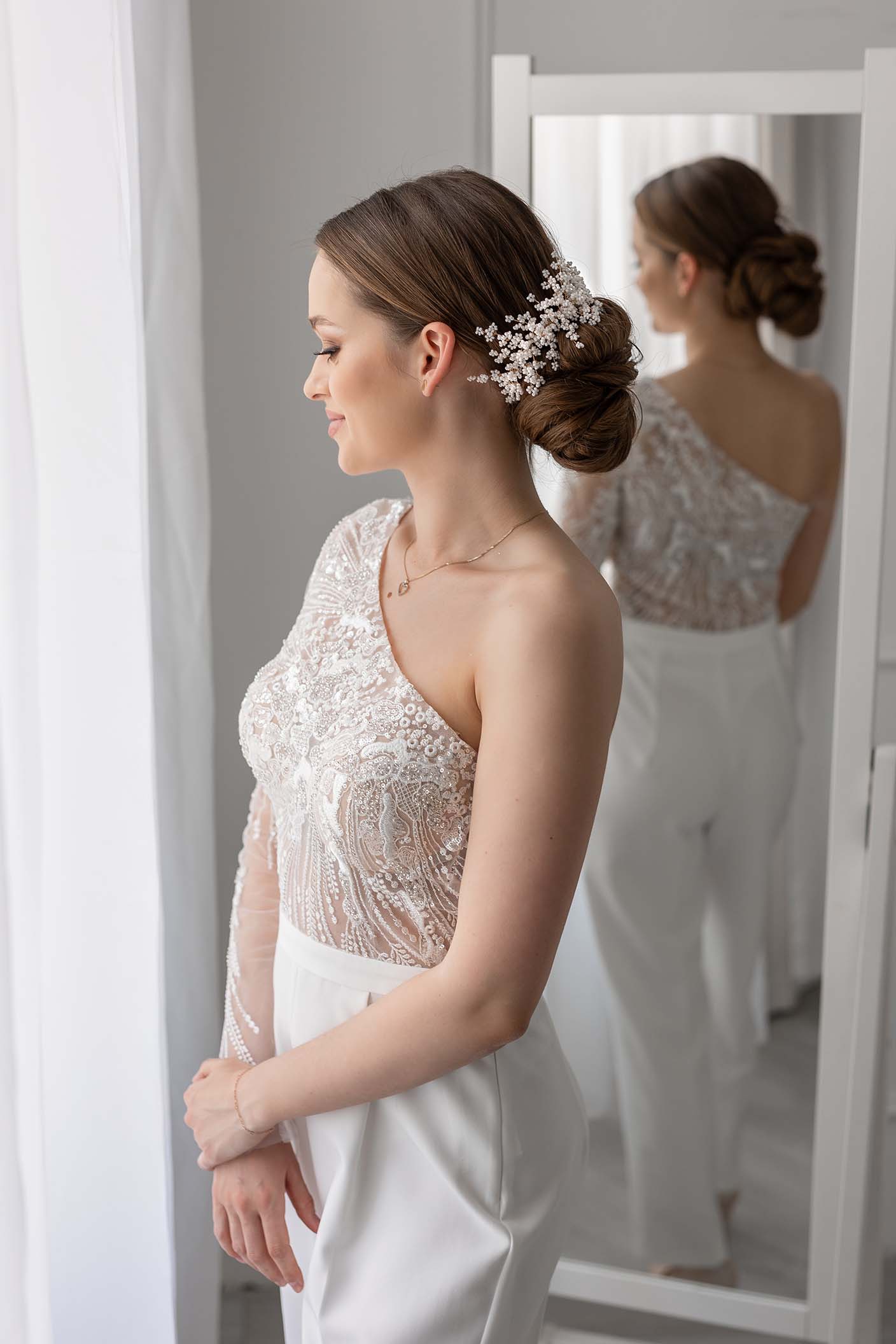 Discover our collection of bridal hair combs, handmade with porcelain flowers, genuine pearls and sparkling crystals. Whether you prefer a delicate touch for a romantic updo or a statement piece for timeless elegance, our wedding hair combs add the perfect finishing detail to your bridal look. Each design is crafted with care to complement your hairstyle and gown.